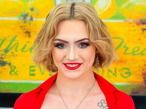 魅惑的なモデル、グレイシー・ゲイツが赤い唇で剃ったマンコを見せる