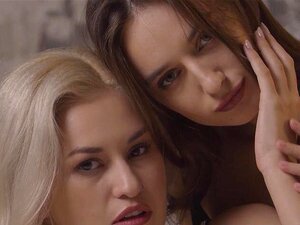 小柄なブロンドのウクライナ人レズビアンベイブ、デミ・フレイが小さな胸で、痩せたブルネットのヨーロッパ人ガールフレンド、グロリア・ソルを脱ぎ、シルクのような肌と大きな自然な胸を愛撫して楽しむ。