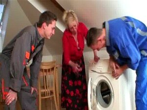 孤独なグランマが二人の修理工のために脚を広げる